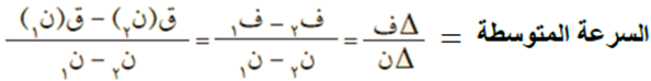 ولكن من المعروف أن حاصل قسمة المسافة على الزمن هو كمية فيزيائية = السرعة المتوسطة. لذا فإن متوسط التغير للاقتران ف = ق (ن) يُسمى السرعة المتوسطة خلال الفترة [ن1، ن2].