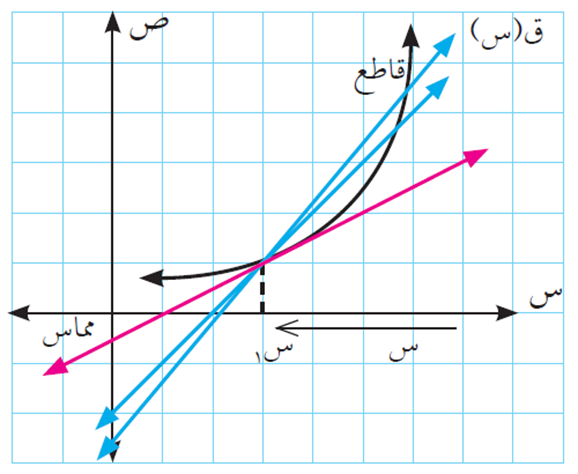 وكانت هذه النهاية موجودة فإننا نسميها معدل التغير للاقتران ق (س) عند س1، أو المشتقة الأولى للاقتران ق (س) عند س = س1، ونقول أن ق (س) قابل للاشتقاق عند س = س1، أي كلما اقتربت س من س1 (أو كلما اقتربت ∆س من الصفر) فإن متوسط تغير الاقتران (ميل القاطع الذي يمر بنقطتين مختلفتين) يؤول إلى معدل تغير الاقتران ق (س) عند نقطة س = س1 (ميل المماس الذي يمر بنقطة واحدة س1)، كما يظهر بالشكل التالي: