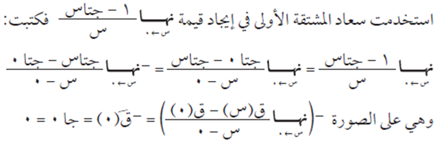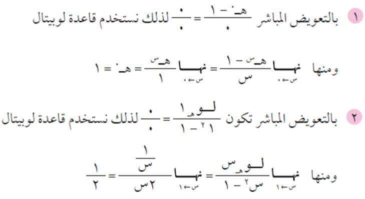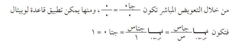 بما أنه بالتعويض المباشر تنتج القيمة ضفر/صفر، إذن نقوم بتطبيق قاعدة لوبيتال: