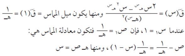ميل المنحنى = ميل المماس ومن ذلك نستنتج أن المشتقة 2 س – 2 = 2، ومنها س = 2.