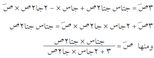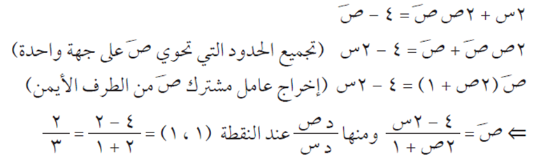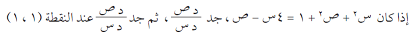 نقوم باشتقاق طرفي المعادلة اشتقاق ضمني بالنسبة إلى س، مع تطبيق قاعدة السلسلة حيثما يلزم تطبيقها، وذلك كما يلي: